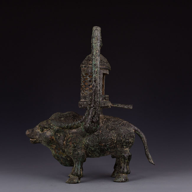 湖南省博物館的西(xi)漢牛形燈,燈為(wei)牛形,兩角(jiao)沿背(bei)的兩側(ce)以(yi)圓管(guan)狀(zhuang)向(xiang)上豎立,并會合為(wei)一(yi),向(xiang)下擴大為(wei)覆(fu)碗狀(zhuang),作為(wei)出煙(yan)(yan)管(guan)。牛腹(fu)中空可盛水,點(dian)燃時(shi)煙(yan)(yan)可通過(guo)腹(fu)中,以(yi)保持室內空氣清潔(jie),側(ce)有銘文十(shi)字,為(wei)當時(shi)長(chang)沙(sha)王劉發或其后(hou)代宗(zong)廟用器。